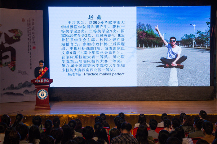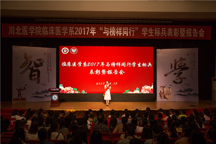 勤奋学习, 青春飞扬,增长本领, 圆梦未来。为大力加强学风建设,激励临床学子健康成才,4月18日晚7点,临床医学系2017年“与榜样同行”学生标兵表彰暨报告会在顺庆校区世纪礼堂举行。学校党委常委、组织部部长胡春梅,学生处处长马静出席大会,临床医学系副主任魏锦、周仲辉与800余名临床师生代表参加活动。
