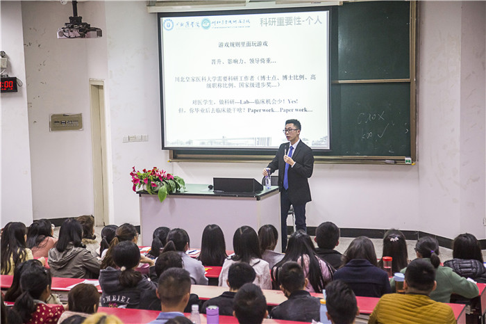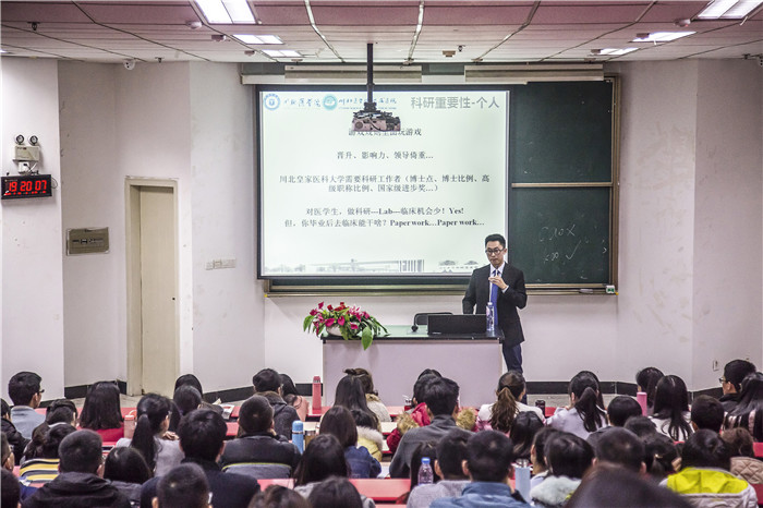作为临床医学系官方微信最美临床人专访人物,年仅33岁的冷政伟博士主持国家自然科学基金、四川省科技厅、教育厅、卫计委项目等6项科学基金。“同济博士后师兄,一个川北医学子的成长模板”成长经历在学子中反响强烈。榜样从线上走入线下,学子纷至沓来,现场座无虚席。