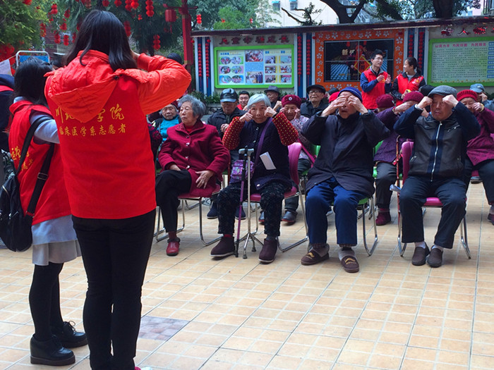 步入福利院,党员志愿者关切地询问老人们的身体状况,就春季多发疾病预防知识及健康饮食方式与老人进行了一对一的宣讲,并重点系统地向老人们讲解了护眼、养生知识,手把手教他们做老年保健操和眼保健操。为活跃活动气氛,同学们还同老人们一起做听曲识歌游戏,与他们共唱经典红歌,活动尾声支部成员们向老人们赠送了健身器材与水果,并诚挚地祝福老人们身体健康,生活顺心。