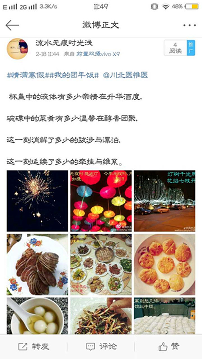 活动历时二个月,共收到参赛作品3100余份。活动中临床学子聚焦“我的家”“团年饭”“身边最美人”等主题,以微博微信和主题班团活动分享等方式,用一幅幅生动照片和一段段温情文字及深情讲述,抒发对家庭的热爱与感恩,对家人的感念与感怀,对家风温暖力量的感悟,传递着尊老爱幼、勤俭持家、邻里互助、家庭和睦、相亲相爱的中华民族传统美德,充分激发临床学子爱国爱家爱校、奋发向上的文明风尚。最终,范鸿鹏和杨莉获得特等奖,王攀、沈雅伦、范云婷获得一等奖。临床2013级汪小玲感触良多:“活动引导我们追求讲道德、尊道德、守道德的生活,激励更多学子在积善成德,明德惟馨的家庭传统美德熏陶中立德修身。”