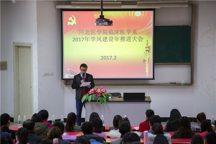 为切实贯彻落实学校党政2017年工作要点,激励广大临床学子形成深学、细悟;严谨、勤勉;明辨、笃行的良好风尚,促进“学风树优,学业增效,学子成才”的系部育人质量保障,2月28日,临床医学系2017年学风建设年推进大会在顺庆校区一教101成功召开。临床医学系党政领导、教师代表及学生骨干300余人参加大会。