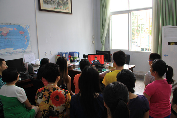 为确保收看的及时性,师生以电脑、手机等多种方式收看庆祝大会直播,并实时参与强国论坛微博话题互动。“不忘初心,继续前进。”盛典开始伊始,习近平总书记在讲话中强调,“我们党已经走过了95年的历程,但我们要永远保持建党时中国共产党人的奋斗精神,永远保持对人民的赤子之心。”、“治国必先治党,治党务必从严。如果管党不力、治党不严,人民群众反映强烈的党内突出问题得不到解决,那我们党迟早会失去执政资格,不可避免被历史淘汰”、“办好中国的事情,关键在党”等等一系列发自肺腑、感人至深的话语,充分彰显了以习近平为总书记的党中央全面从严治党的决心,充分表明了有着8875.8万的中国共产党“不忘初心、继续前行”的勇气和魄力。在观看直播的过程中,师生党员聚精会神投入到习总书记的讲话当中,不时爆发发自内心的掌声。