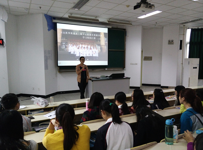 为了使一年后将要参加全程临床教学的临床医学系2013级同学们客观了解学校现行全程临床教学的整体运行情况,10月25日上午,来自遂宁市中心医院、成都市第五人民医院、重庆三峡中心医院、达州市中心医院等八个全程教学点的八名临床医学系2012级学生深入到2013级四个合班就临床学子普遍关心的全程教学模式、师资力量、教学条件、教学评价方式等进行了交流。