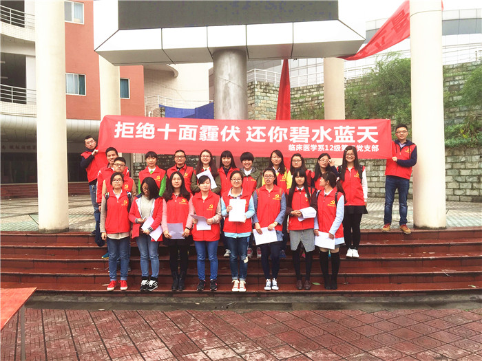 雾霾已经成为我国当前环境污染首要问题。为增强大学生的环境保护意识,呼吁大家关注并了解雾霾的危害,4月9日,临床医学系2012级第二党支部在顺庆校区开展了以“拒绝雾霾,拥抱蓝天”为主题的党日活动。