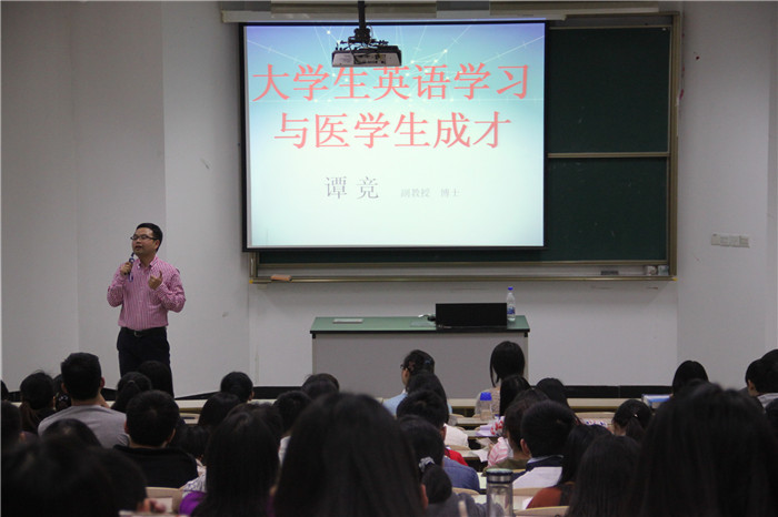 为不断增强医学生的英语学习与运用能力,3月26日晚,临床医学系党总支举办了大学生英语学习与医学生成才讲座,附属医院谭竞副教授担任主讲。临床医学系2012级近400名学生到场听取了讲座。