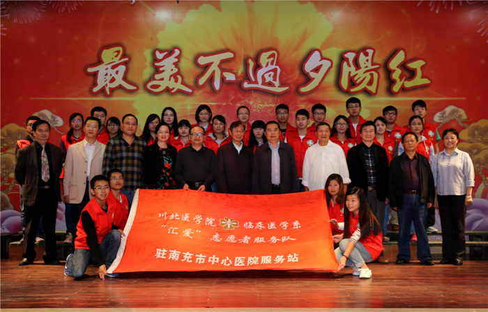 九月骄阳,晚秋桂香。10月24日下午2:30,由南充市中心人民医院党委办公室、医院行政办公室、离退休干部管理科、医院工会与总务科联合主办的“敬老月”老年文体表演在医院老门诊三楼学术厅成功举行。中共南充市委宣传部常务副部长赵东等领导应邀参加了此次活动。我校临床医学系“汇爱”志愿服务队共有70余名志愿者参加并观看了文体表演。