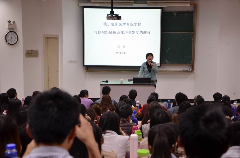 康健院长在报告中就临床学子密切相关的临床医学专业学位、住院医师规范化培训、专业学位与住院医师规范化培训衔接三个专题,从医改的时代背景、中外医生培养模式比较、满足群众日益增长的健康服务需求的实践要求,医学教育教学改革进程、医生成长路径等层面系统阐述了专业学位与科学学位的异同、住院医师规范化培训“5+3模式”、发展目标、质量要求、基地建设、信息管理、管理考核及认证,客观分析了住院医师规范化培训制度对学校教育教学改革带来的挑战与机遇,语重心长地希望临床学子注重良好职业道德磨砺、强化医学理论知识积累,规范临床技能训练,提高学业综合能力。