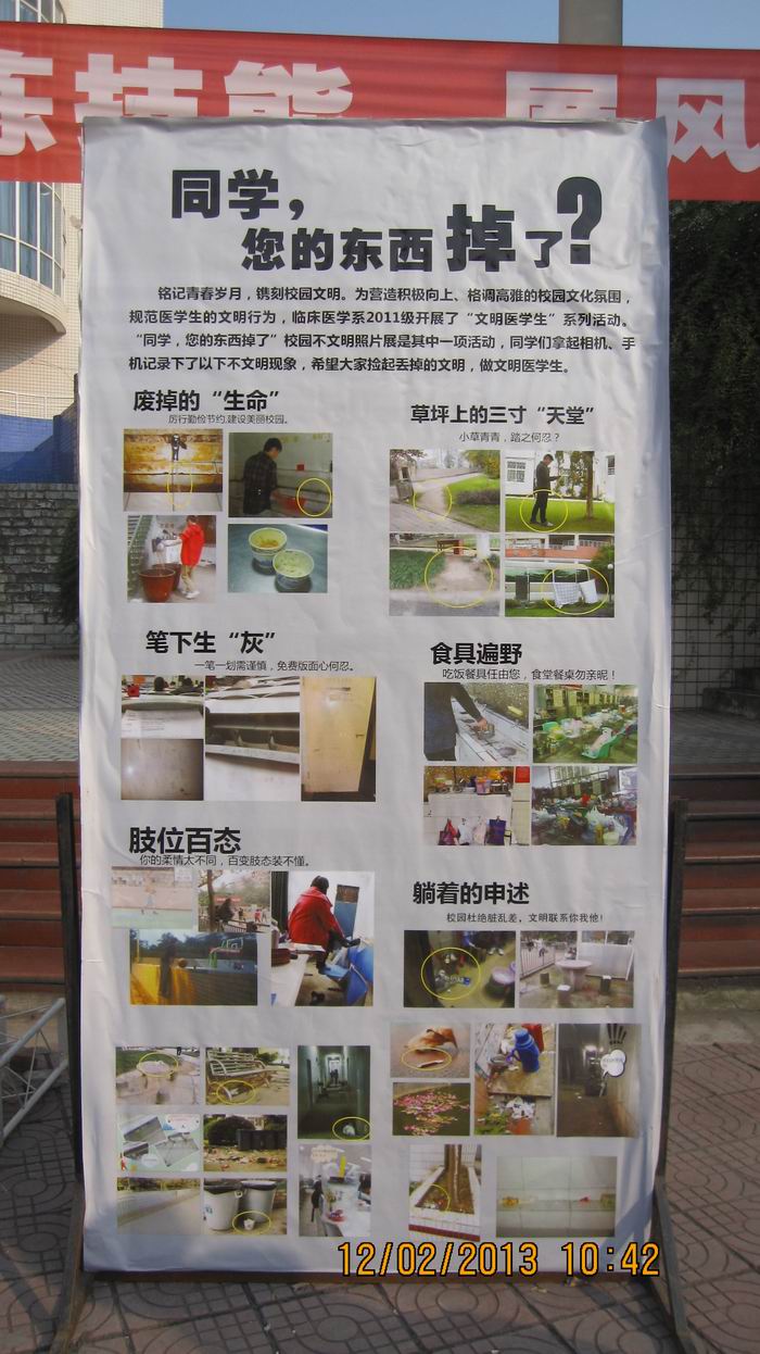 针对发生在身边的细微点滴容易被忽视的不文明行为,10月初以来,2011级在同学中发起了主题为“同学,你东西掉了”的照片征集活动。同学们纷纷拿起手中的照相机,将焦点聚集到身边的种种不文明现象。照片内容涉及乱扔垃圾、不爱护公物、不节约用水、浪费食物、乱刻乱画、举止不雅等等不文明行为,活动展版以活生生的图片和让人猛醒的文字对大家予以警示教育。