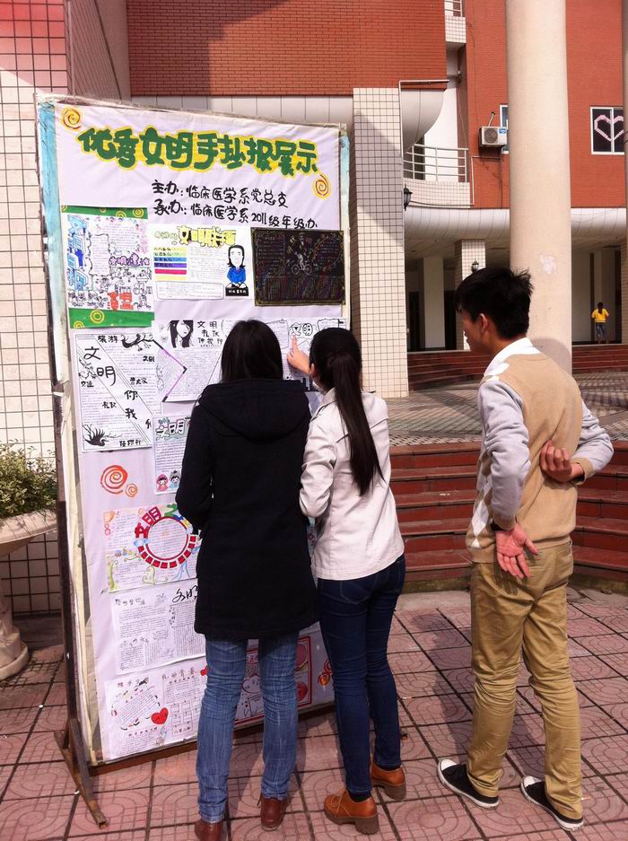 在文艺创作中传播精神文明,在传播文明中弘扬主流文化。10月19日至10月25日,开展了以“文明医学生 从我做起”为主题的文明手抄报征集活动,从110份的参赛作品中评出24份优秀作品予以表彰展出,在同学中产生了的积极影响。