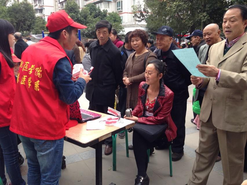 活动分为两组开展:第一组学生党员负责义诊和高血压、糖尿病预防知识的宣传,活动中累计为200余名群众免费测量血压并给予健康指导,同时党员志愿者还一对一的为群众进行高血压、糖尿病预防知识的宣讲并发放了健康知识宣传单200份。第二组学生党员负责心脑血管疾病和口腔疾病的宣讲,他们一边给群众耐心讲解心脑血管疾病的预防知识、药物的服用方法和不良反应,为群众发放阿司匹林等治疗药物;另一边为群众检查口腔健康状况,示范正确的刷牙方式,讲解日常的口腔保健、预防知识以及出现口腔疾病处理方式,受益群众多达500余人次。