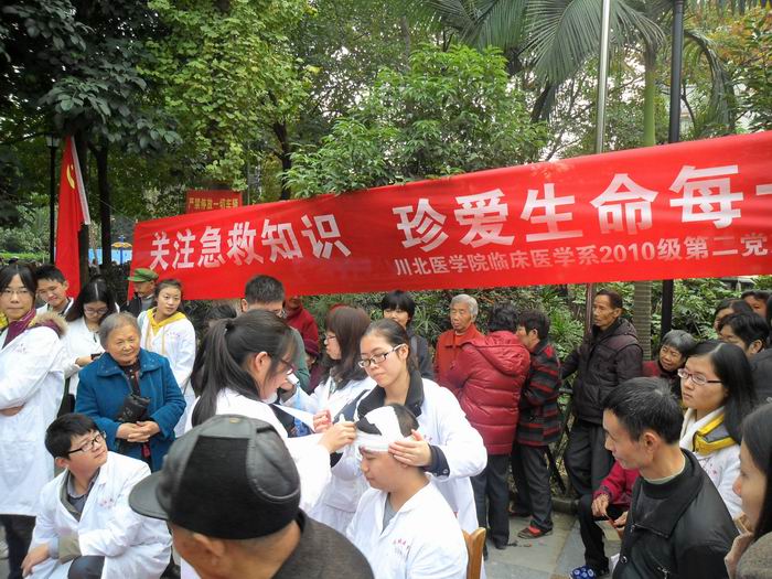 2013年11月23日下午,临床医学系党总支2010级第2党支部在南充市果山公园开展了健康急救知识宣讲活动。60余位临床医学系党员骨干参加了此次活动。