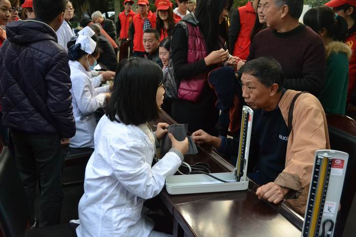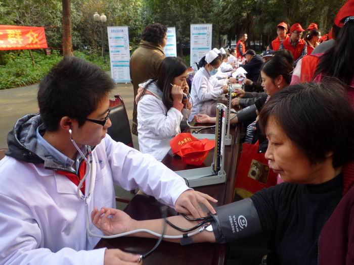 活动中,2011级第二党支部一行37人明细分工,吸引很多社区居民及路过市民前来参加。附属医院医生们为到来的群众测血糖,耐心地讲解了常见病症的治疗和保健知识,党员志愿者为群众测血压,一对一为前来候诊的群众耐心讲解糖尿病防治知识,并分发了牙膏、肥皂、纸巾等日常生活用品。本次活动共测量了血压300多人次,血糖200多人次,受到来往群众的一致好评。一位老奶奶笑着说:“党的政策就是好,还让你们这些医学生来为我们服务。”