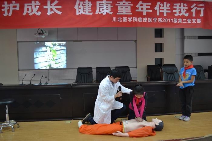 活动中,学生党员围绕“用爱呵护成长,健康童年伴我行”的主题,运用所学医学知识为600余名小学生及学生家长讲解了健康饮食、健康用眼、健康睡眠等健康知识,并制作专题PPT就如何科学有效处置溺水、中毒、触电、中暑、摔倒等生活常见急救医学知识进行了系统宣讲,实用的讲解受到小朋友和家长的极大欢迎。尤其是在现场教授测体温、止鼻血、用创可贴处理小伤口以及进行心脏复苏等互动环节中,小学生们的踊跃参与将现场氛围推到高潮。
