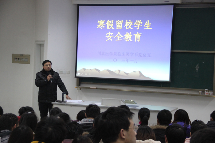 为确保留校学生有一个安全、充实的寒假,1月14日下午17:00,临床医学系党总支在顺庆校区第一教学楼201教室组织召开了寒假留校学生安全教育会议。临床医学系党总支副书记冉茂成、各年级办辅导员老师、150余名临床医学系本专科留校学生参加了会议。