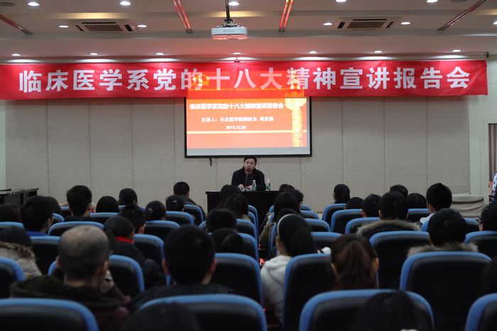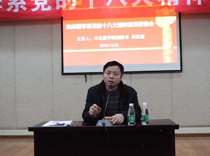 12月26日,数九的南充,寒意袭人。学院附属医院影像六楼报告厅内,却是暖意融融,掌声不断。当天下午,学院副院长、学院学习宣传贯彻党的十八大精神宣讲团成员周京国为临床医学系200余名党员师生代表宣讲十八大精神,并对现场师生提出的问题一一进行回答。理论联系实际的宣讲,坦诚的思想碰撞和交流,赢得了临床师生的阵阵掌声。