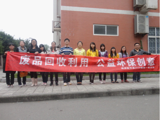 2012年10月19日至27日,由临床医学系2010级第一党支部承办的“主题党日活动”——“废品回收利用,公益环保创意”活动顺利开展。首先第一阶段进行各合班PPT宣传和食堂门口横幅签字,并进行活动报名。10月20日,第二阶段废品回收顺利并利用回收废品进行公益品制作。27日晚上6点到8点在二教204教室举行第三阶段“公益环保创意大赛”。 大约持续了两个多小时,在激烈的角逐中18组脱颖而出,分别获得了一、二、三等奖,大赛在热烈的气氛中圆满落幕。