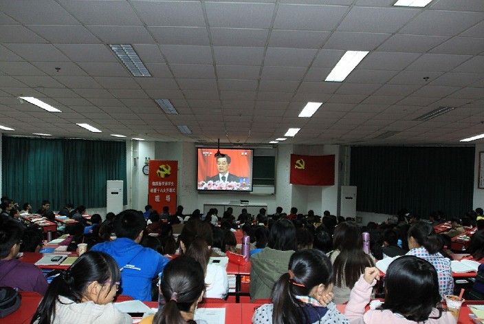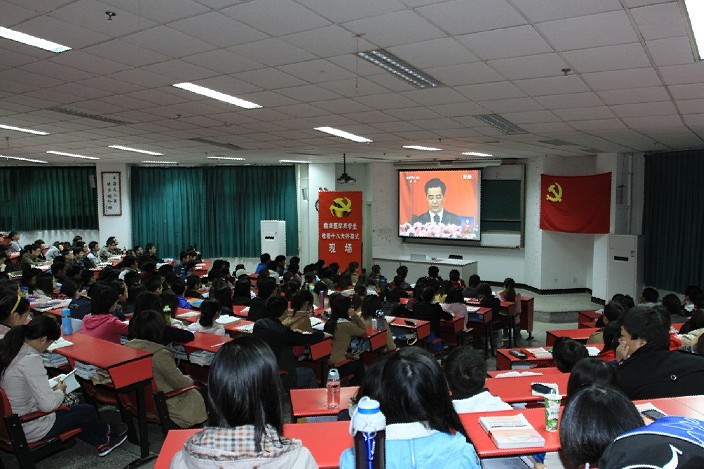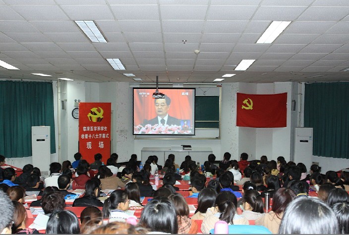 11月8日上午9:0:0,我院顺庆校区一教101室座无虚席,喜庆热烈。由临床医学系党总支主办的学习十八精神系列活动之“临床学子观看党的十八大开幕式”如期举行。300多名临床师生欢聚一堂,共同见证这一中国人民政治生活中的盛大历史时刻。