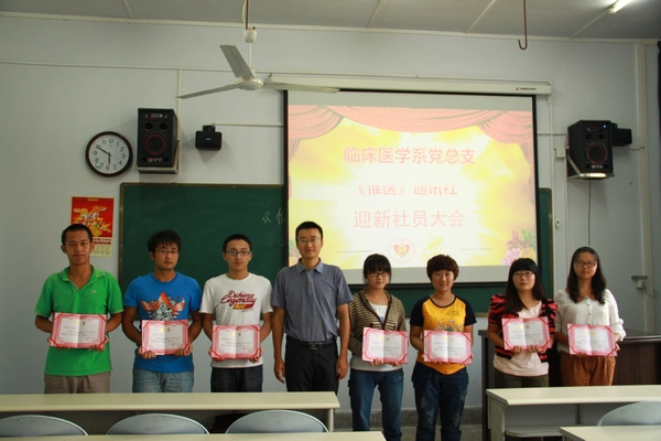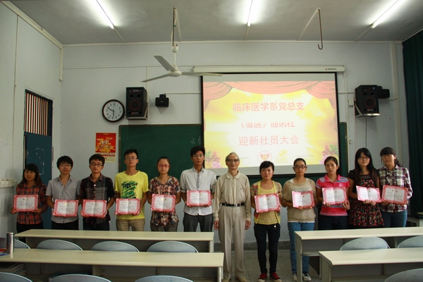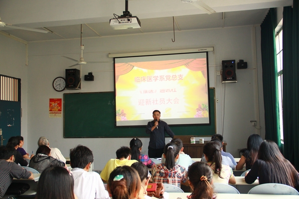 2012年9月17日下午,临床医学系党总支《惟医》通讯社迎新社员大会在我院顺庆校区二教203教室召开。学院督导委员会专家、临床医学系关工委副主任何忠阶、思政教研部副主任陈毅君、临床医学系党总支全体老师以及通讯社新老成员参加会议。
