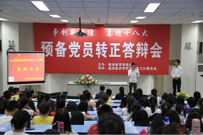 为进一步保证学生党员发展质量,提高党员素质,5月7日晚7点,由临床医学系党总支主办,临床医学系学生党建工作委员会承办的临床医学系预备党员转正答辩会在顺庆校区一教102隆重举行。学院党委副书记李成军出席并讲话。学院组织部部长殷秀及临床医学系党总支300余名党员观摩答辩会。