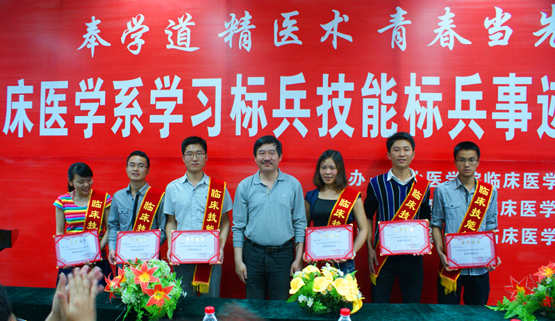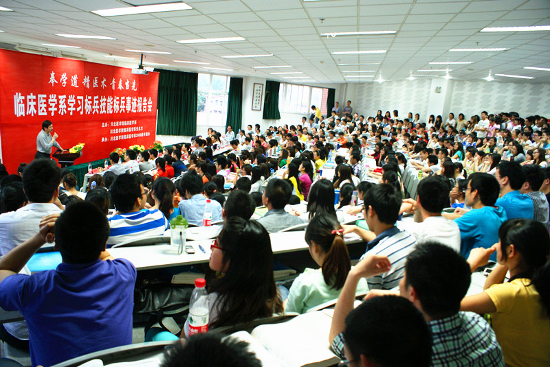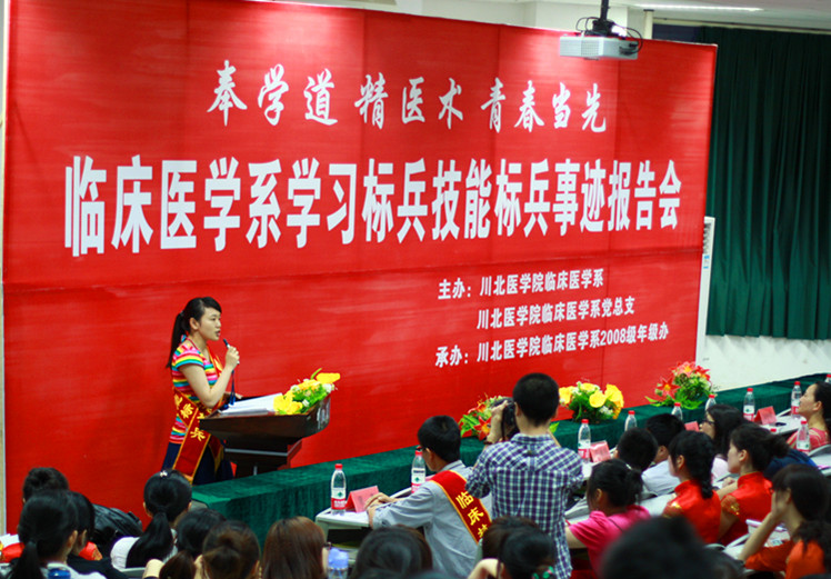 奉学道,精医术,青春当先。由临床医学系、临床医学系党总支联合举办的学习标兵技能标兵事迹报告会24日晚在顺庆校区举行。学院副院长雷军,临床医学系400余师生出席报告会。