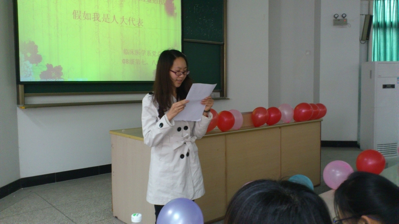 4月19日上午10:30,一场名为“假如我是人大代表”的主题党日活动在一教303教室展开。为深入学习“两会”的精神,临床医学系2008级第七、八党支部联合举办了此次别开生面的活动。第七、第八党支部所有党员同志参加此次主题党日活动,第八党支部支部书记冉亚梅主持活动。