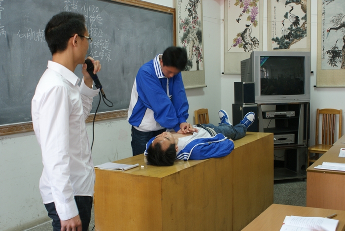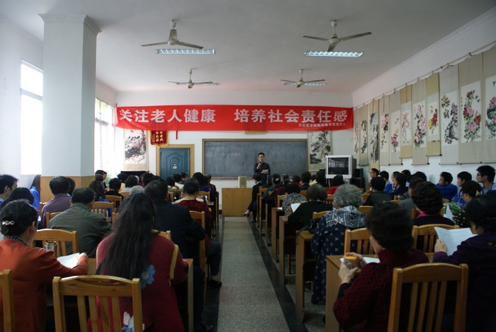 活动伊始,由临床医学系学生党建工作委员会副主任邱彬担任主讲,针对“老年人营养与健康”的相关知识从饮食、睡眠、运动、常见疾病四个方面进行讲解。讲授既贴近老年人生活,又方便记忆,简单实用。在随后的“急救知识大家学”互动环节,老年大学的学员们在同学们“一教一”的帮助下,学习了如何进行“心肺复苏”的急救方法。最后,学生党员为到场的老年朋友们测量血压并对老年人关心的健康问题进行了解答。