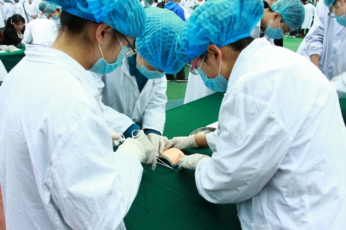随着李成军副书记宣布此次大赛首站外科缝合比赛的开始,近四百位选手分六个批次展开了激烈的比拼与展示。体现专业与技能的场面,让到场观摩的同学们凝神观看,不时发出啧啧的赞叹声,其中还有不少学弟学妹们。整个赛场井然有序,气氛热烈而精彩。