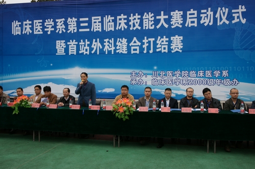 李成军副书记首先发表了简短讲话。他指出,医学技术的快速发展,对当代医学生提出了更高的要求,临床技能是医学生培养质量的核心内容,体现了学生的动手能力、实践能力、心理素质、团队合作等综合能力与水平,要求学生必须更加重视。他希望同学们赛出水平,通过竞赛积累经验,在今后的学习中加强训练,不断提高。力争在全国技能大赛中取得更加优异的成绩。
