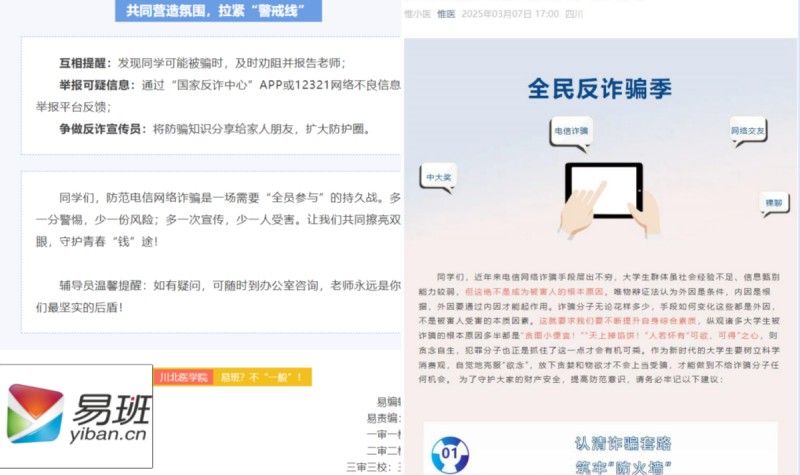 线上融媒,全覆盖宣传,反诈知识触手可及。为扩大宣传覆盖面,临床医学院学生工作党总支充分利用新媒体平台开展反诈知识宣传。通过“易班”“微信公众号”发布诈骗手段解析、防骗技巧知识,以喜闻乐见、生动易懂的形式提醒同学们警惕各种骗术,形成线上线下联动的宣传矩阵。