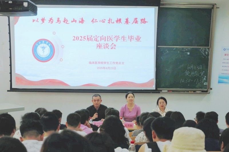 为切实做好定向医学生毕业工作,听取毕业生对学校建设发展的意见建议,增强毕业生扎根基层的责任感和使命感,总结育人经验,持续提升育人质量,近日,临床医学院学生工作党总支在顺庆校区第二教学楼101教室召开2025届定向医学生毕业座谈会,党总支书记夏都颖出席会议,毕业年级辅导员参加会议。