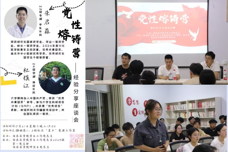 活动中,2023级专硕甲乳外科专业朱启森结合自身成长经历,从科研启蒙、资源整合到核心竞争力培养,讲述了自己如何从一名普通的大学生蜕变为研究生国家奖学金、“五四奖章”等荣誉的获得者,通过深入浅出的讲解和分享为同学们厘清了学业规划及发展路径;2024级学硕神经外科专业杜镇江则聚焦考研策略及政策解读,讲述了自己选择学硕的缘由,并详细介绍了医学专业中专硕和学硕的区别,指出不论是选择学硕还是专硕,适合自己的才是最好的。2024级第一党支部书记党延森谈到,同学们作为未来医疗卫生事业领域的中坚力量,要始终以人民健康为宗旨,要以身边优秀党员为镜,将个人发展融入国家医疗卫生事业大局,在专业学习、临床实践、科研创新中积极践行“敬佑生命、救死扶伤”的誓言和担当。