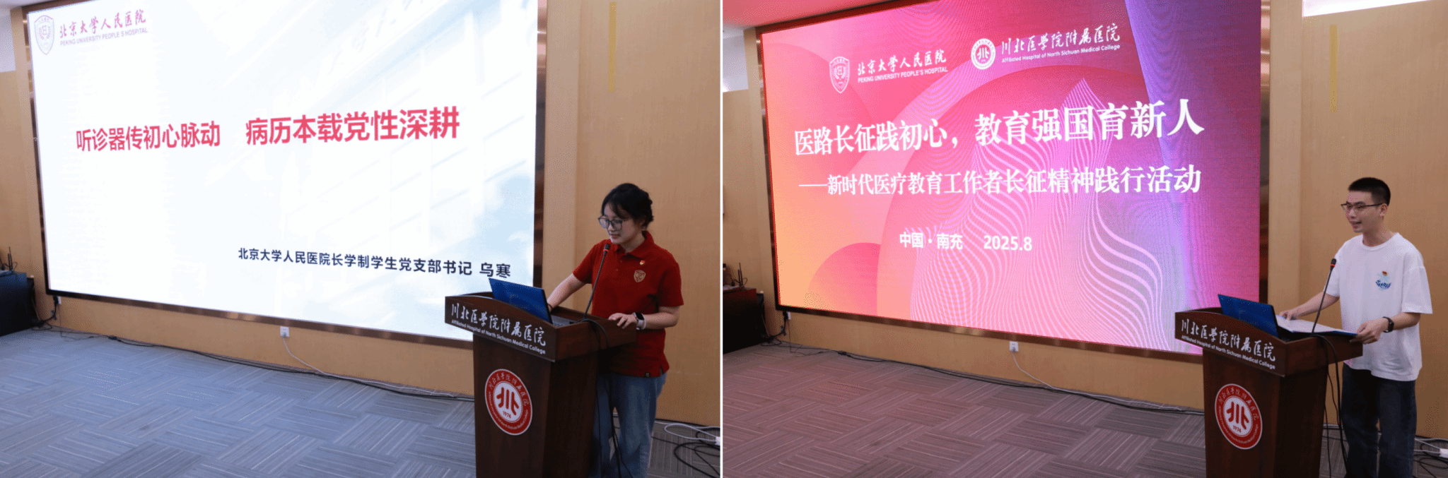 北京大学人民医院八年制学生乌寒与川北医学院五年制学生胡文龙分别代表发言。乌寒分享从临床到科研、从学生到生活的人民医体验,展现了人民医学生的成长之路;胡文龙则通过分享川北医学院特有的卓越医生班培养模式、学生成长“三导师制”等学习经历,诠释了我院应用型医学人才培养的创新实践。两院学子就“价值引领塑医德、知识学习强根基、能力锻造促发展”等议题展开讨论,为医学教育注入青春动能。