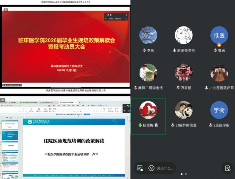 近日,临床医学院在“惟医”名辅导员工作室直播平台召开2026届毕业生规培政策解读暨报考动员大会,川北医学院附属医院毕业后培训部部长卢茸,临床医学院学生工作党总支书记夏都颖、副书记杨雪梅,全体毕业年级辅导员,以及2000余名毕业生和家长云端相聚,共赴这场助力医学学子职业起航的专题盛会。