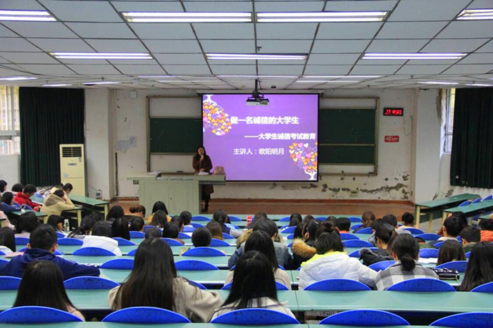 随着期末考试的陆续展开,近日,管理学院学生科老师利用周末形势教育课开展“做一名诚信的大学生”主题教育活动。老师从高校考风考纪现状、考试作弊现象及原因、高校考试作弊危害和加强诚信教育、严抓考风考纪的途径几个方面进行了深入浅出的讲解,提出了“诚信考试,拒绝作弊”的要求,给正面临期末考试以及英语四六级考试的同学们敲响了警钟。