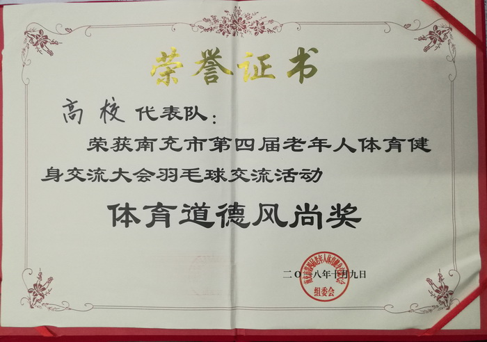10月10-17日, 由南充市人民政府主办,南充市教育和体育局、南充市老体协承办的“南充市第四届老年人体育健身交流大会”在顺庆区西山运动场日月馆、星光馆等地举行,我校代表南充四高校组队参加了羽毛球、广场健身舞、钓鱼交流活动。