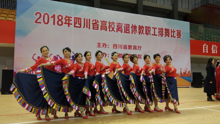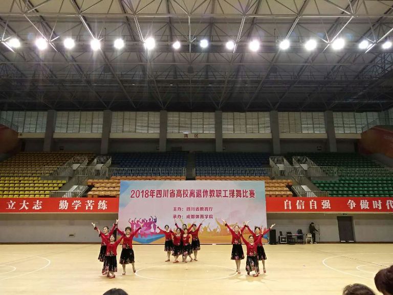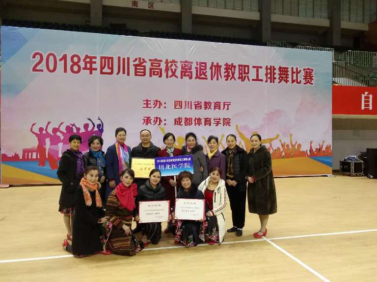 为进一步贯彻落实全国《全民健身条例》和《四川省教育厅关于开展全省高等学校老年文体活动的通知》精神,11月16日至18日,由四川省教育厅主办、成都体育学院承办的“2018年四川省高校离退休教职工排舞比赛”在该校综合馆隆重举行,全省16所高校离退休教职工代表队参加了角逐,我校代表队荣获规定曲目、自选曲目优胜奖和团体三等奖。