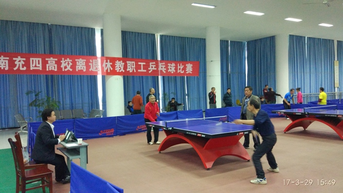 3月29日下午,由南充四高校老体协主办,西华师范大学承办的2017年“南充四高校老体协乒乓球比赛”在西华师范大学教职工活动中心举行,我校和西南石油大学、西华师范大学、南充职业技术学院的24名老同志参加了本次比赛。比赛由每校各派男、女3人上场,采取校校见面的单循环赛,计团体总分。我校陈华绪、刘东元、李成元、刘玉香、马肖菊、熊昌姝6名老同志参加了比赛。经过三个小时的激烈角逐,西华师范大学获得团体冠军,我校获得团体亚军。这次活动促进了四高校老同志之间的交流,增进了友谊。