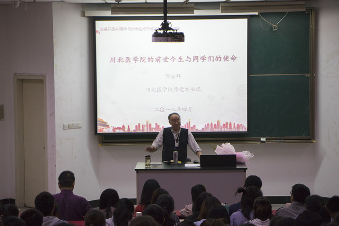 今年是改革开放四十周年,也是学校确立的质量提升年和改革深化年。为了加深同学们对改革开放的认识与感悟,提升同学们知校爱校的情怀,弘扬“艰苦奋斗、自强不息”的川北医精神,临床医学系特邀请到川北医学院原党委书记汤公群为师生们展开了一场 “川北医学院的前世今生与同学们的使命”专题讲座。