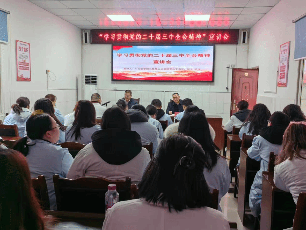 胡澜从1978年党的十一届三中全会开启了改革开放和社会主义现代化建设新时期,2013年党的十八届三中全会开启了新时代全面深化改革、系统整体设计推进改革新征程,2024年党的二十届三中全会将谱写进一步全面深化改革、推进中国式现代化的时代新篇入手,讲述了党的这三次三中全会承前启后、继往开来,都是划时代的,都在党的历史和新中国的历史上具有里程碑的意义。围绕深刻领会和把握进一步全面深化改革的重大意义,深刻领会和把握进一步全面深化改革的指导思想,深刻领会和把握进一步全面深化改革的总目标,深刻领会和把握进一步全面深化改革的重大原则,深刻领会和把握进一步全面深化改革的重大举措这5大主题进行了宣讲。并结合深化医药卫生体制改革,必须坚持尽力而为、量力而行,完善基本公共服务制度体系, 加强普惠性、基础性、兜底性民生建设,解决好人民最关心最直接最现实的利益问题,不断满足人民对美好生活的向往。
