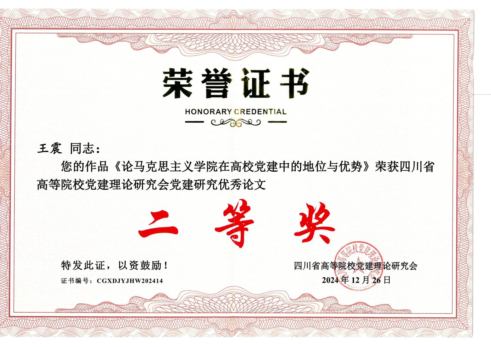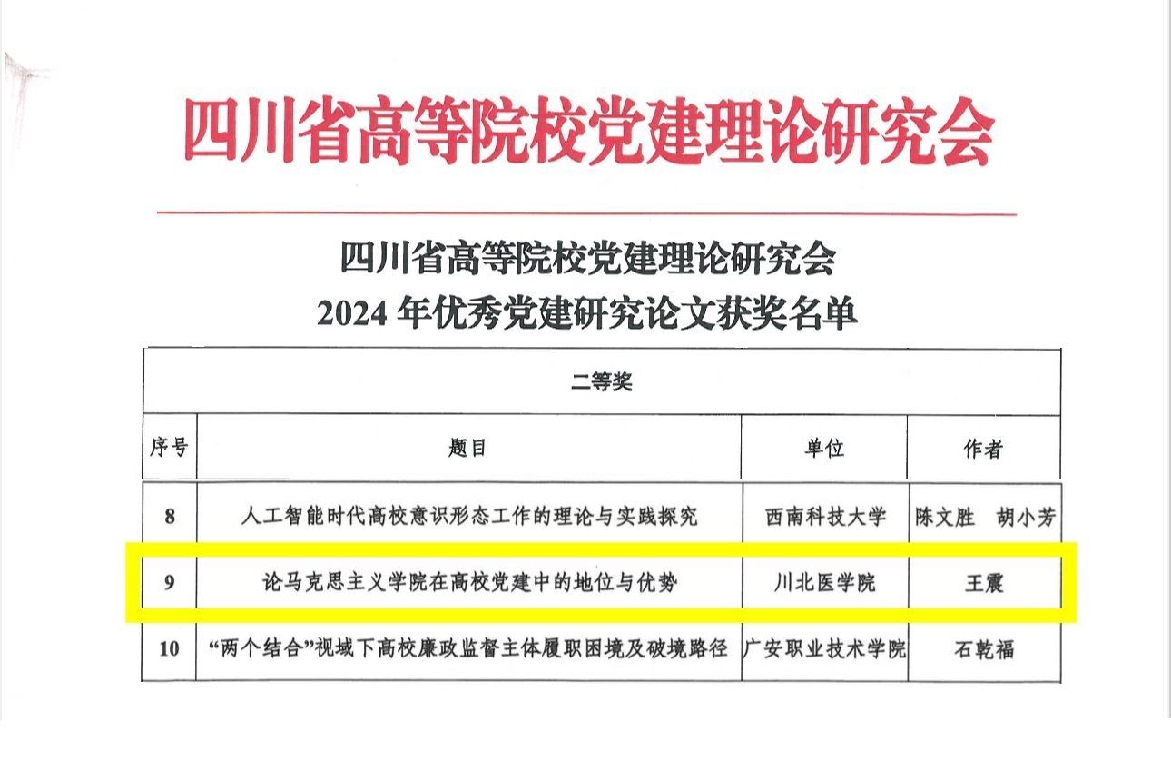 12月26日,四川省高校党建理论研究会第五次会员大会在四川大学召开,全省139所高校的170余名会员参加了大会。会议表彰了2024年优秀党建研究论文和党建工作案例,由党委组织部牵头选送、马克思主义学院王震教授撰写的理论文章《论马克思主义学院在高校党建中的地位和优势》荣膺二等奖,实现了学校在该领域获奖成果的突破。