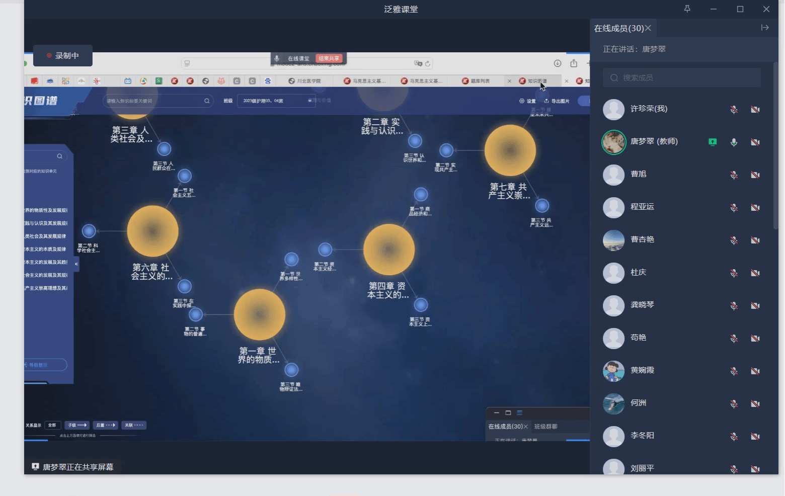 首先,唐老师以《马克思主义基本原理》课程为例,分析了目前课程线上建设的情况;其次,针对课程建设的不足,从五个方面进行了针对性讲解:如线上课程的章节建设的完善;加大资料的上传;试题和试卷的设置;知识图谱的建设、目标图谱、问题图谱、课程思政图谱的建立和完善;AI助教的丰富等。再次,特别针对智慧课程建设知识图谱建设和AI助教培育进行了重点、详细展示和说明。最后,唐老师和与会教师进行了互动交流,对大家提出的问题进行耐心讲解。