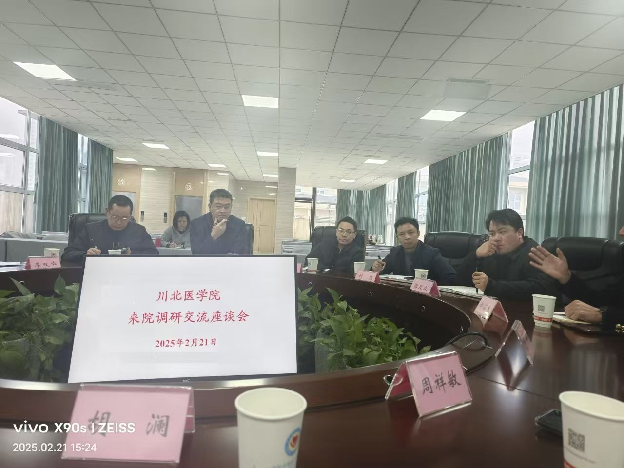 2月21日,由我院党总支书记、院长胡澜带队,学校及相关单位代表一行7人,赴资阳市第四人民医院调研交流。我校临床医学系96级校友、资阳市第四人民医院党委副书记、院长白大应主持了交流会,院党委委员、副院长伍小鱼及相关部门负责同志参加了交流。
