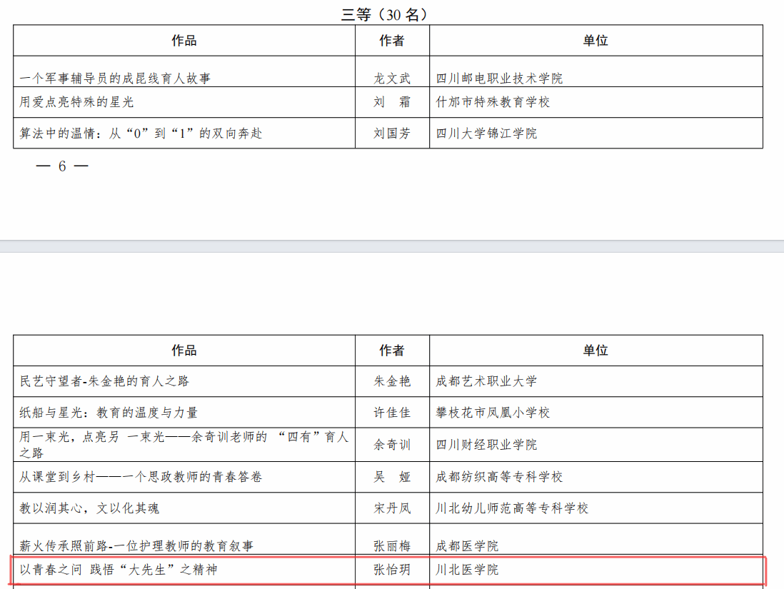 近日,四川省教育厅公布了“讲述我的育人故事”优秀作品评选结果,我院教师张怡玥的育人故事作品《以青春之问 践悟“大先生”之精神》荣获三等奖,展现了我院教师立德树人的教育风采。