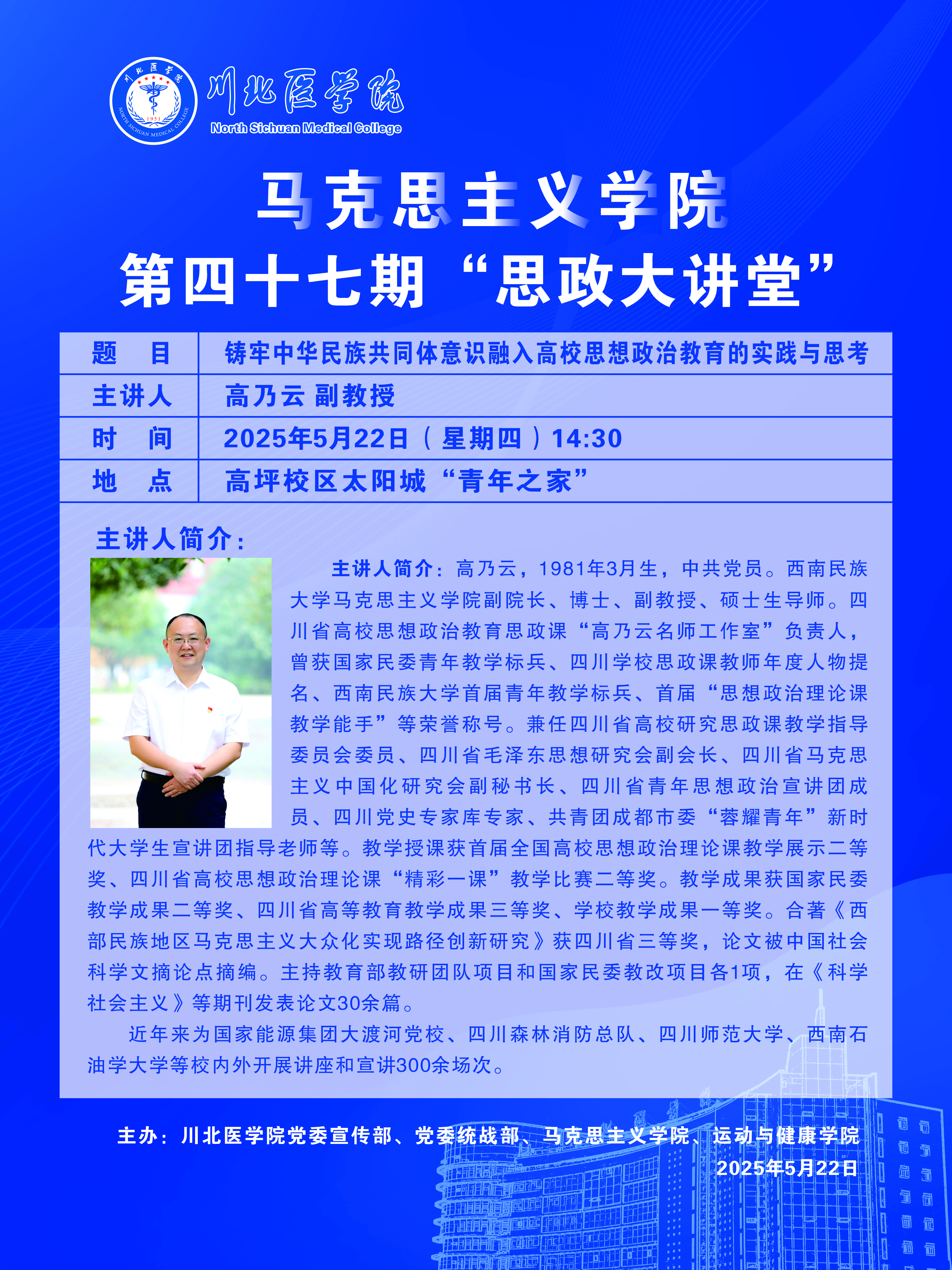 主讲人简介:高乃云,1981年3月生,中共党员。西南民族大学马克思主义学院副院长、博士、副教授、硕士生导师。四川省高校思想政治教育思政课“高乃云名师工作室”负责人,曾获国家民委青年教学标兵、四川学校思政课教师年度人物提名、西南民族大学首届青年教学标兵、首届“思想政治理论课教学能手”等荣誉称号。兼任四川省高校研究思政课教学指导委员会委员、四川省毛泽东思想研究会副会长、四川省马克思主义中国化研究会副秘书长、四川省青年思想政治宣讲团成员、四川党史专家库专家、共青团成都市委“蓉耀青年”新时代大学生宣讲团指导老师等。教学授课获首届全国高校思想政治理论课教学展示二等奖、四川省高校思想政治理论课“精彩一课”教学比赛二等奖。教学成果获国家民委教学成果二等奖、四川省高等教育教学成果三等奖、学校教学成果一等奖。合著《西部民族地区马克思主义大众化实现路径创新研究》获四川省三等奖,论文被中国社会科学文摘论点摘编。主持教育部教研团队项目和国家民委教改项目各1项,在《科学社会主义》等期刊发表论文30余篇。