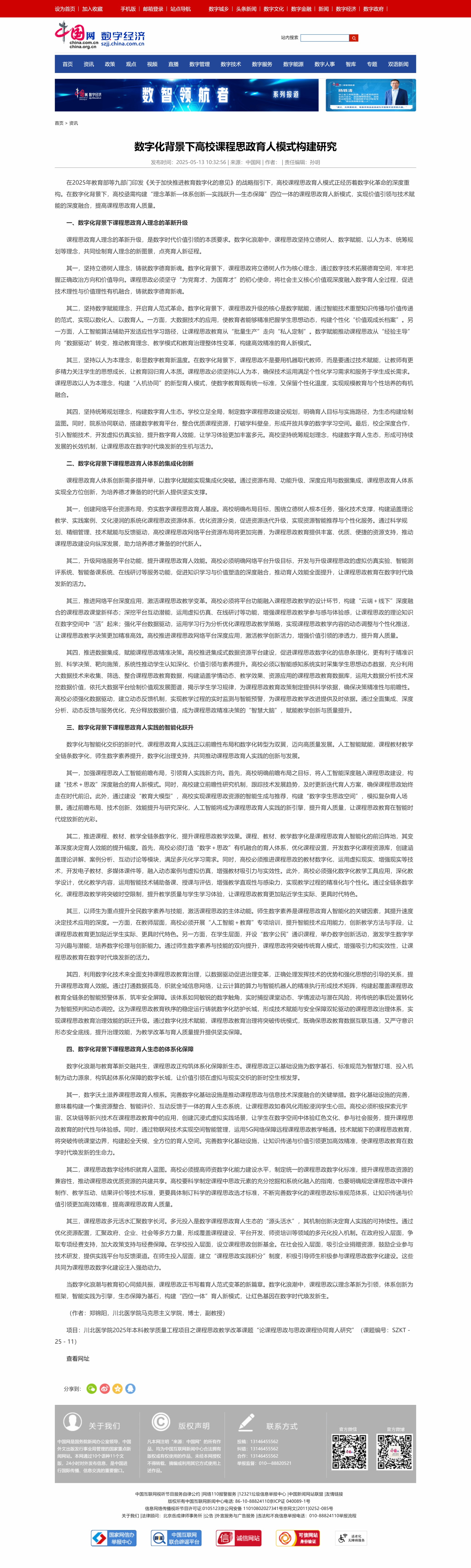 2025年5月13日,我院教师郑锦阳在中国网数字经济频道发表理论文章《数字化背景下高校课程思政育人模式构建研究》。详情如下: