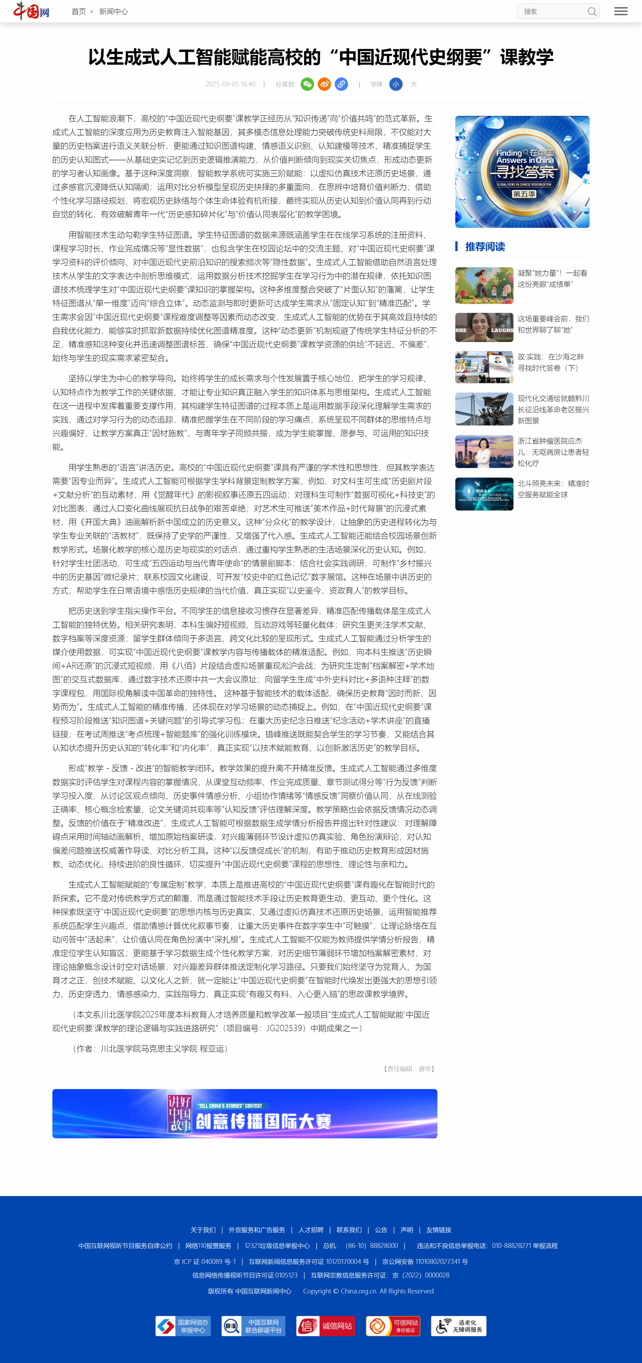 2025年9月5日,我院教师程亚运在中国网新闻中心频道发表理论文章《以生成式人工智能赋能高校的“中国近现代史纲要”课教学》。详情如下: