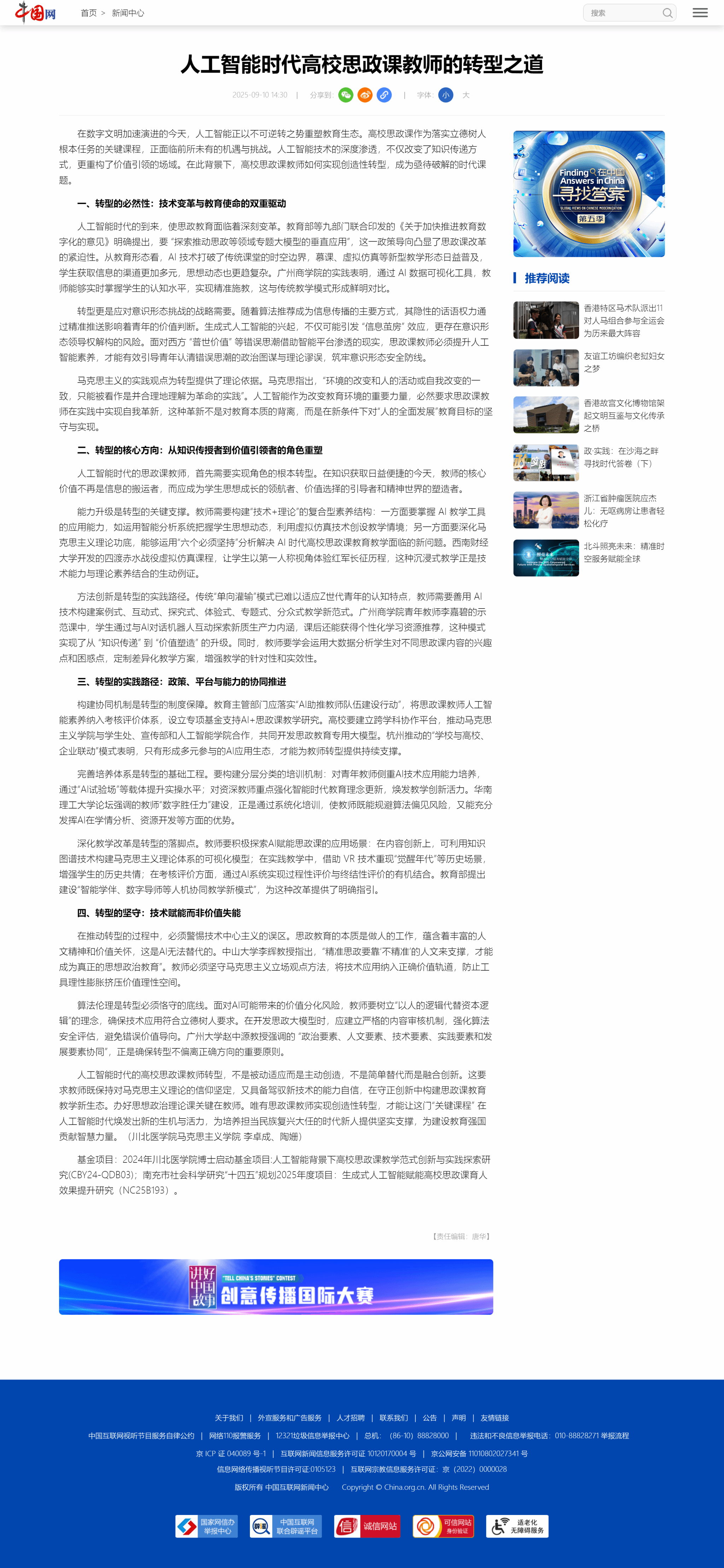 2025年9月10日,我院教师李卓成、陶姗在中国网新闻中心频道发表理论文章《人工智能时代高校思政课教师的转型之道》。详情如下: