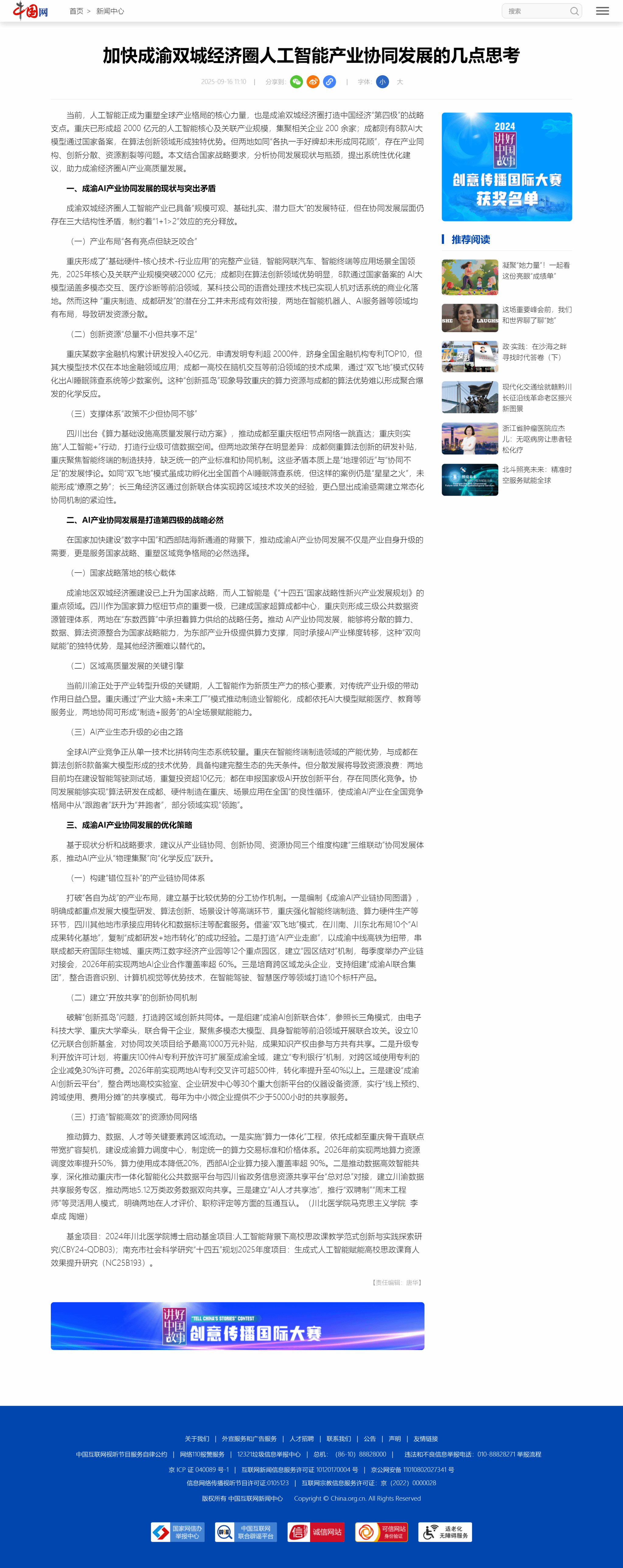 2025年9月16日,我院教师李卓成、陶姗在中国网新闻中心频道发表理论文章《加快成渝双城经济圈人工智能产业协同发展的几点思考》。详情如下: