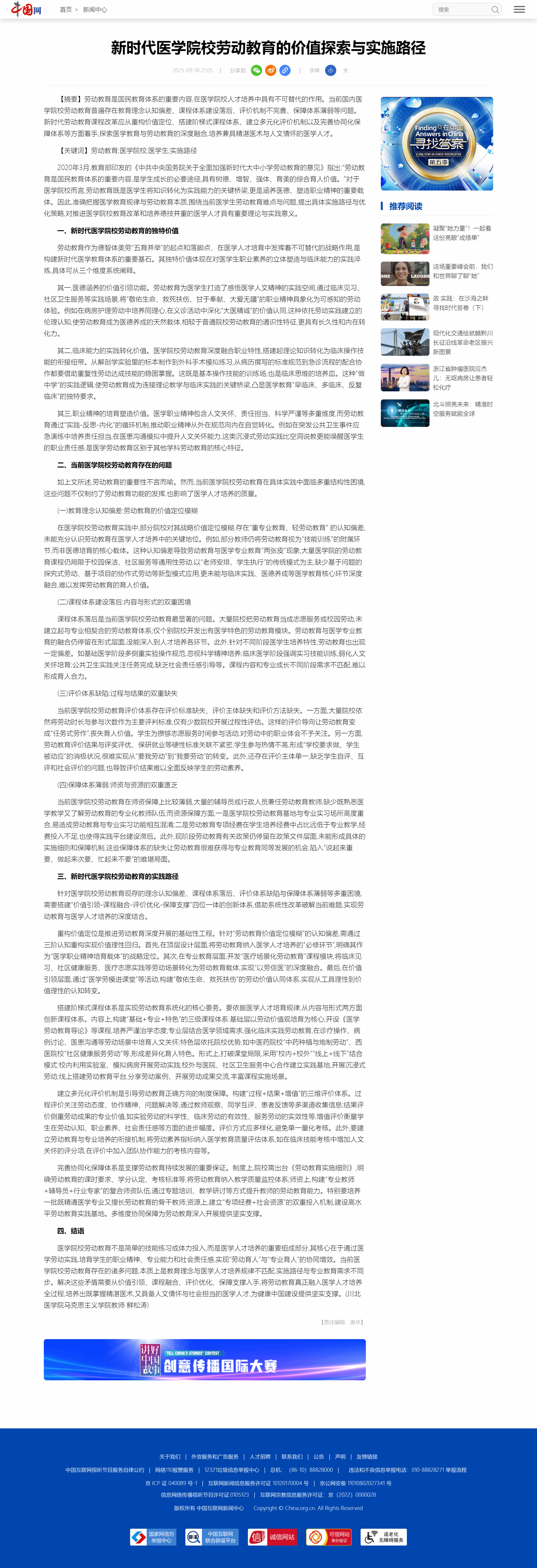 2025年9月18日,我院教师鲜松涛在中国网新闻中心频道发表理论文章《新时代医学院校劳动教育的价值探索与实施路径》。详情如下: