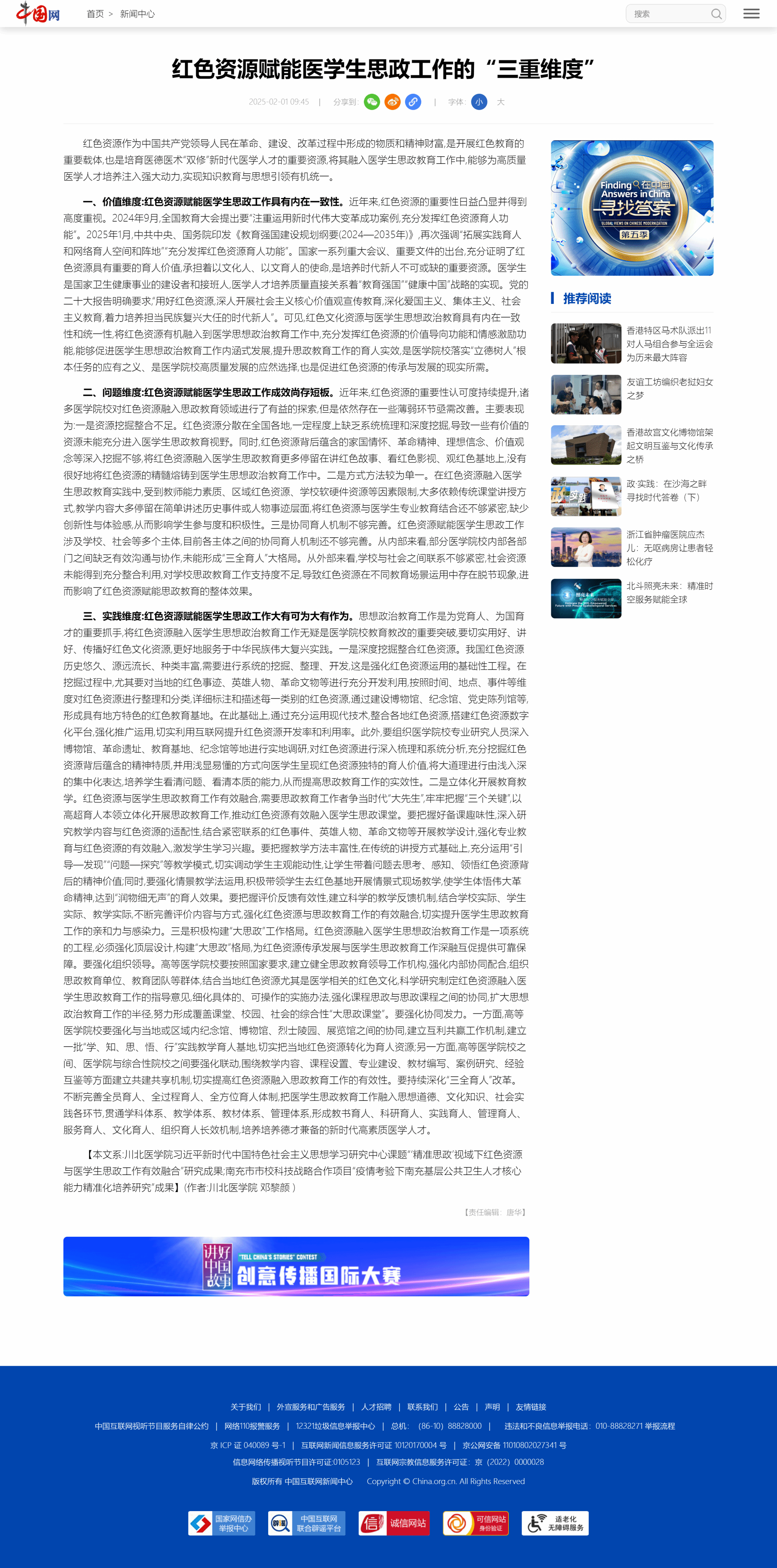 2025年2月1日,我院教师邓黎颜在中国网新闻中心频道发表理论文章《红色资源赋能医学生思政工作的“三重维度”》。详情如下: